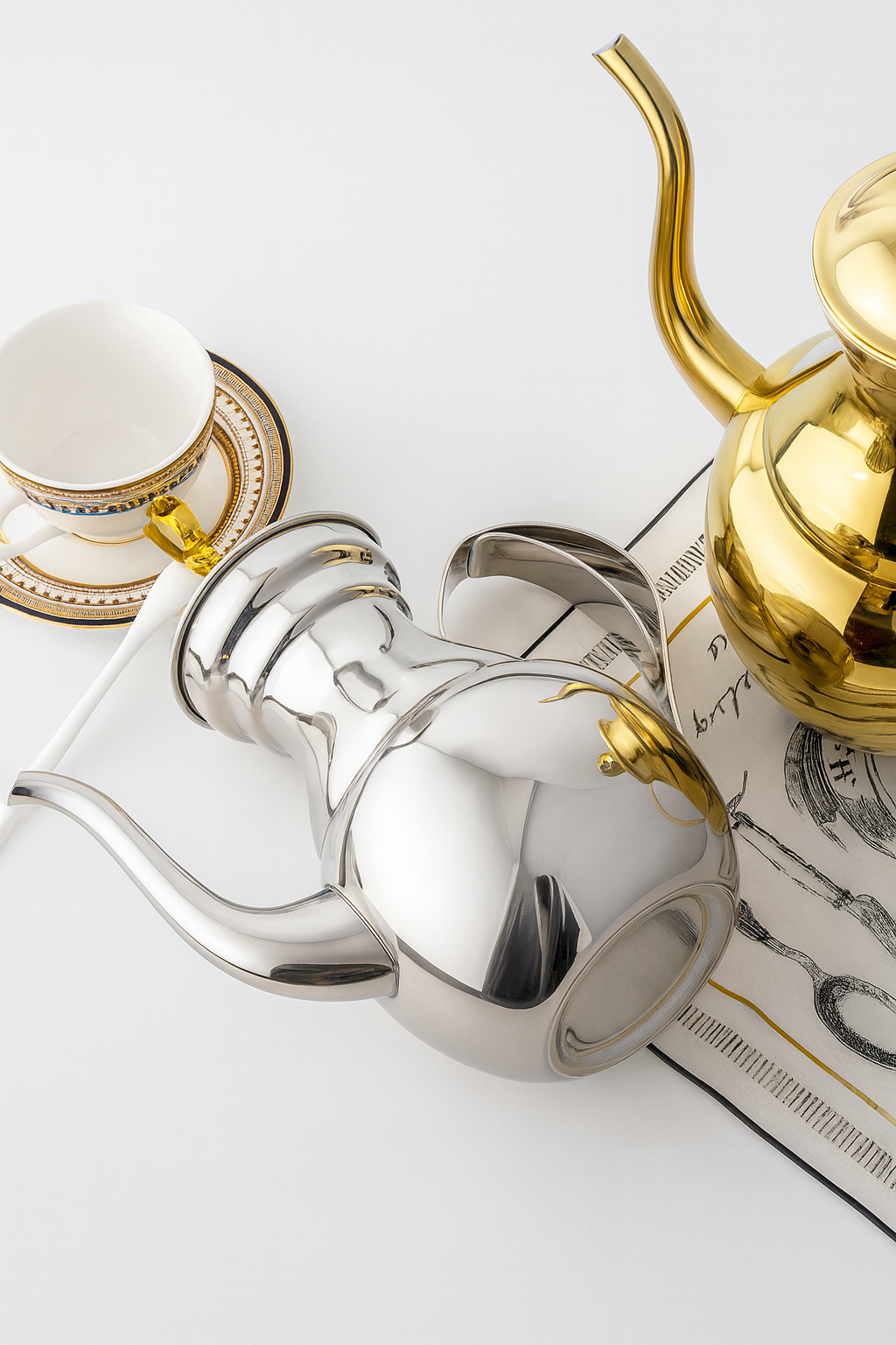 Sa poignée arquée ergonomique assure confort et sécurité, tandis que son bec long et courbé incarne la grâce du rituel oriental.